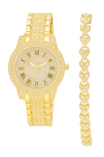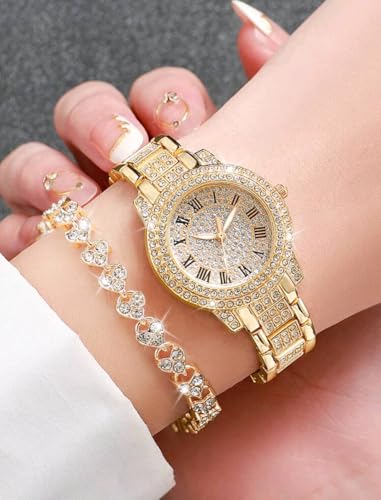 Generic - طقم ساعة حريمي ذهبي – ساعة مرصعة بالكامل + سوار قلوب كريستال – تصميم فخم بلمعة ملوكية