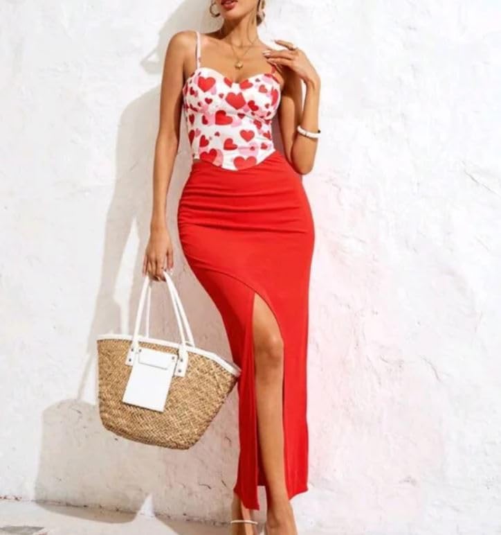 Generic - فستان بحمالات رفيعة بطبعة قلب للنساء، مجموعة من قطعتين باللونين الاحمر والابيض، تنورة ماكسي بفتحة عالية مع نمط عيد الحب