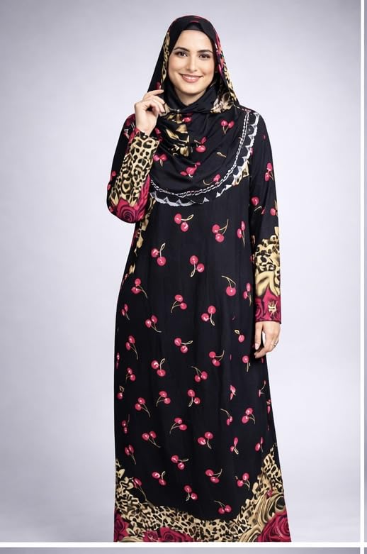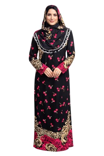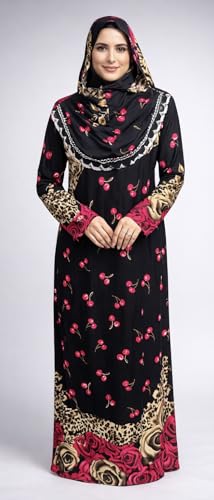 Generic - عباية إسلامية مع حجاب باللون الأسود مع طبعات الكرز ونقشة جلد فهد بأكمام طويلة وطول ماكسي مزين بتصميم الورود والسلاسل للنساء