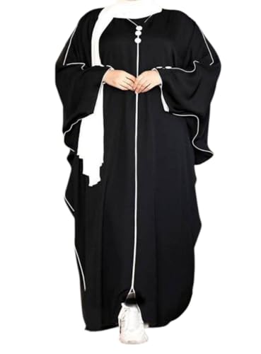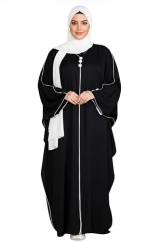 Generic - عباية نسائية بتصميم كيمونو،اسدال حريمي أسود مع تفاصيل بيضاء، جلابيه قطعه واحده لرمضان والعيد قماش كريب سي واي جل، مقاس واحد حتى 90 كيلو