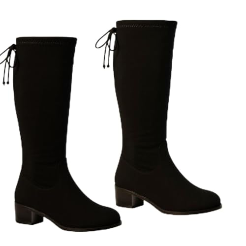 Generic - أحذية نسائية طويلة حتى الركبة، أسود، كعب مكعب، بأربطة خلفية مقاس 37
