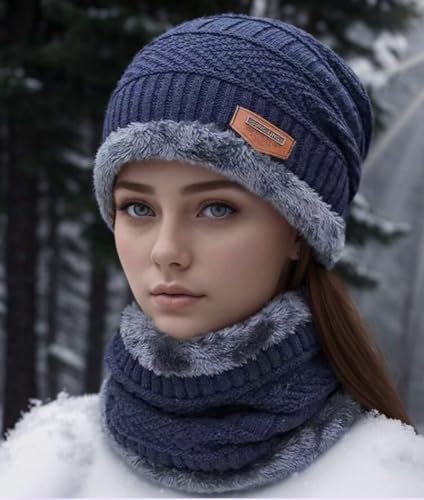 Generic - طقم قبعة محبوكة وغطاء رقبة للنساء، لون سادة، مبطن حراري، للخريف/الشتاء، طقم قبعة ووشاح عصرية، ازرق