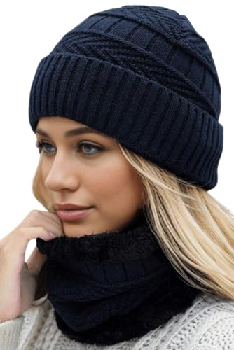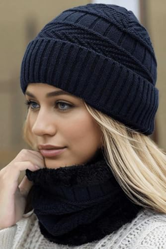 Generic - طقم طاقية منسوجة وغطاء رقبة للنساء، لون سادة، بطانة حرارية للخريف والشتاء، طقم طاقية وسكارف عصري، أزرق غامق