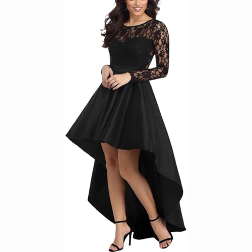 Generic - فستان نسائي من الدانتيل والاسكوبا، أسود، بتصميم هاي لو مع أكمام طويلة من الدانتيل