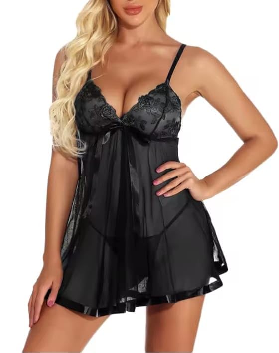 Generic - ملابس نوم بيبي دول دانتيل بحمالة رفيعة رقبة على شكل حرف V للنساء، أسود