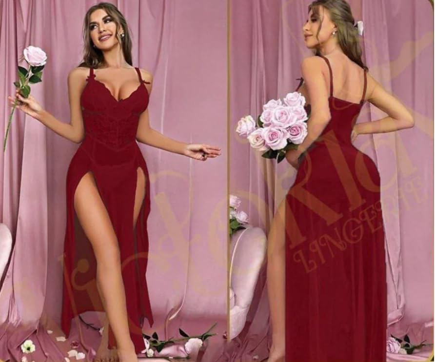 Generic - فستان ماكسي للنساء من الدانتيل مع فتحة عالية ورقبة على شكل قلب، فستان سهرة رسمي، لون أحمر «Burgundy»