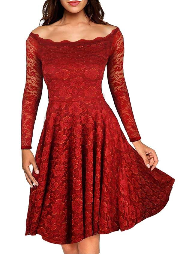 Generic - فستان دانتيل نسائي بأكمام طويلة وياقة واسعة، أحمر، مبطن، تصميم كلاسيكي أنيق