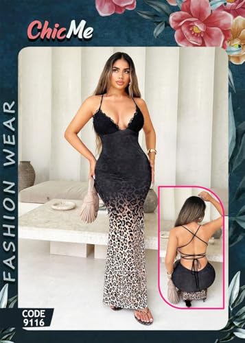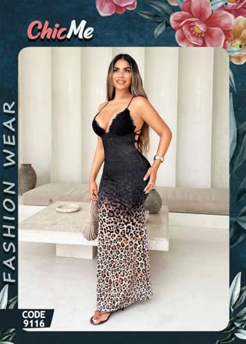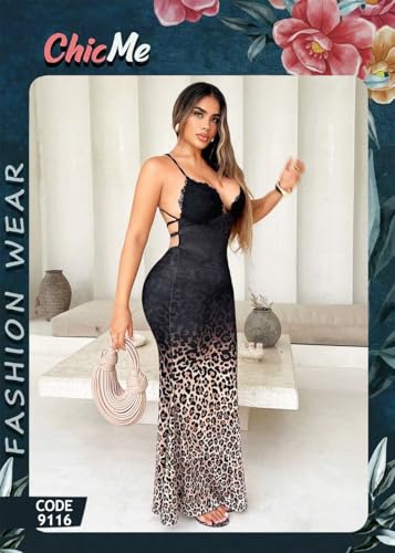 Generic - فستان لانجيري ماكسي للنساء بحواف من الدانتيل، طباعة جلد الفهد بلون اسود، حزام سباغيتي، نمط بودي كون، تصميم متدرج متدرج