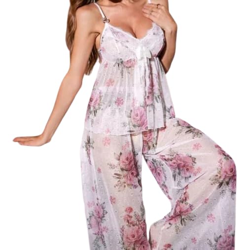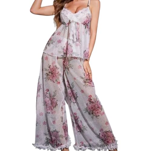 Generic - لانجيري بيجامة نسائية من التل مزينة بالدانتيل - بيجامة نوم أنثوية مريحة - وان سايز يناسب من 55 حتى 90 كجم