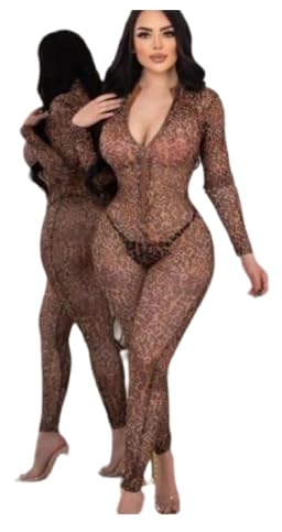 Generic - جمبسوت لانجيري باكمام طويلة بطبعة جلد الفهد للنساء - بودي كون شبكي شفاف مثير - ملابس نوم من قطعة واحدة بنمط تايجر