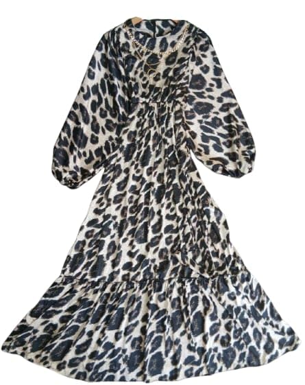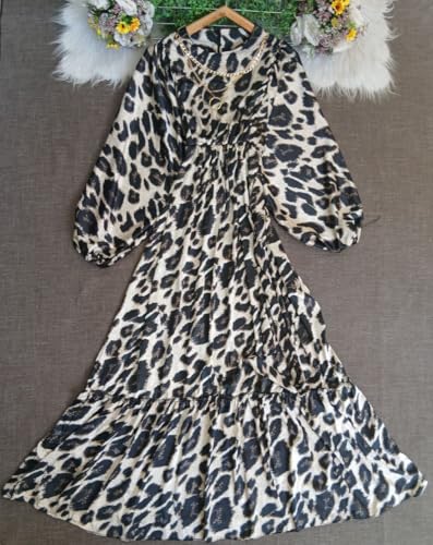 Generic - فستان نسائي طويل بنقشة جلد النمر، أكمام منتفخة، تصميم متموج
