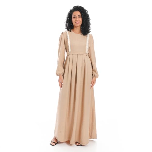 Generic - فستان كتان نسائي طويل، لون بيج، تصميم كلاسيكي أنيق، مناسب للمناسبات اليومية