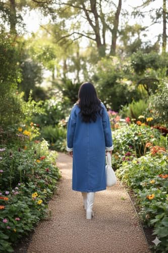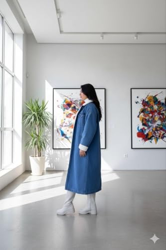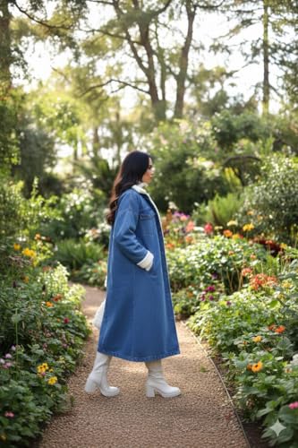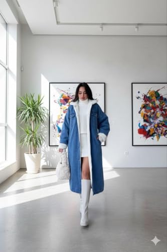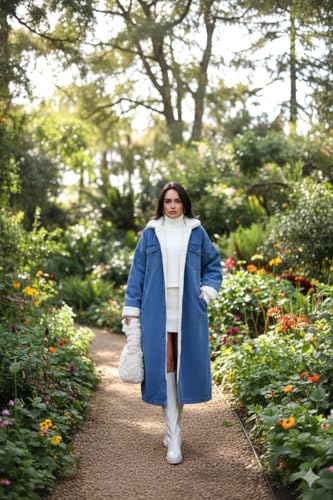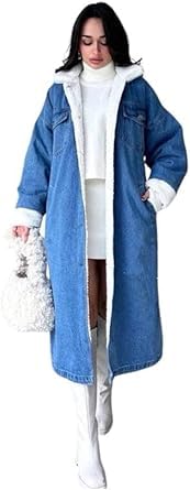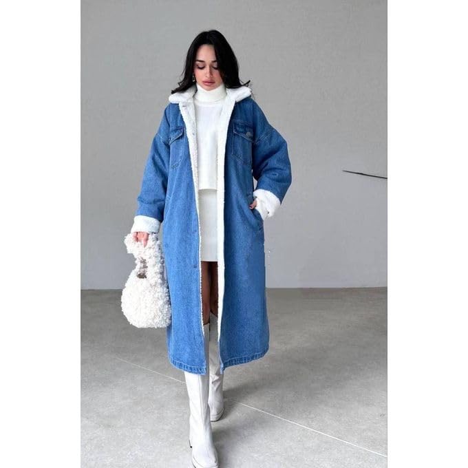 Generic - جاكيت جينز نسائي طويل مبطن فرو شيربا – معطف شتوي دافئ بقصة أوفر سايز – لون أزرق