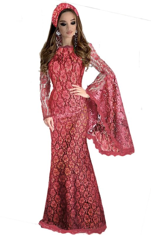 Generic - فستان لانجيرى نسائي طويل بكم واسع وبندانة من خامة الدانتيل مبطن M احمر