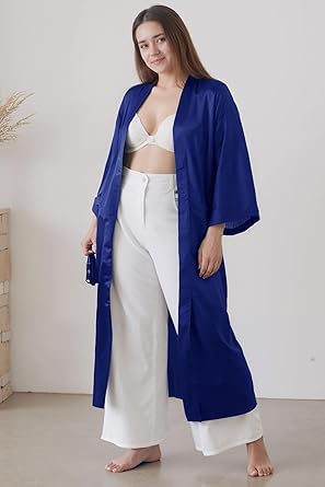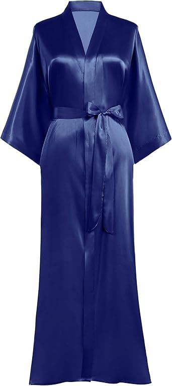 Generic - روب لانجري ساتان طويل باكمام واسعة للنساء باللون الازرق الغامق مقاس خاص من 90 :130 كيلوجرام