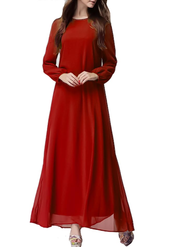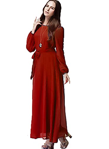 Generic - فستان شيفون طويل للنساء بأكمام طويلة مع حزام خصر وبطانة، أحمر
