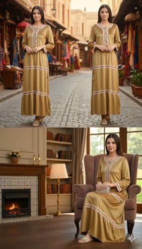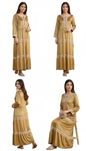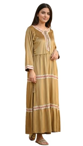 Generic - فستان ماكسي نسائي بأكمام طويلة، لون ذهبي، تصميم متدرج مع تطريز، طراز عربي تقليدي