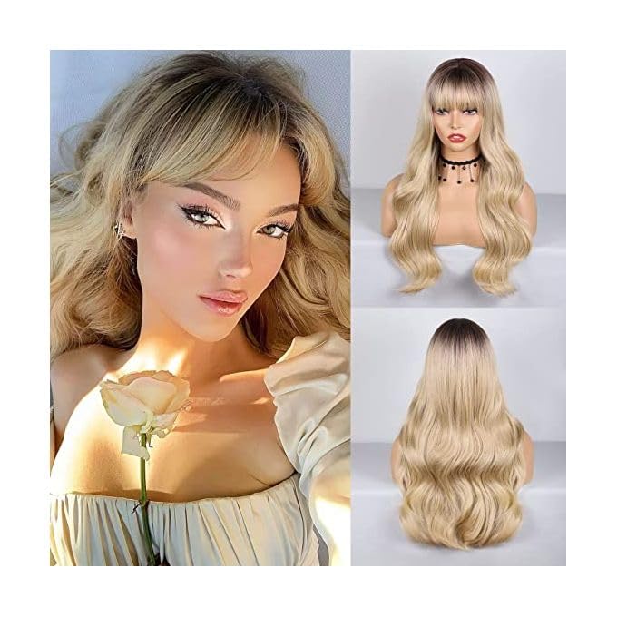Generic - باروكة شعر مستعار نسائية، شعر طويل مموج، لون أشقر أومبري مع جذور داكنة، مع غرة