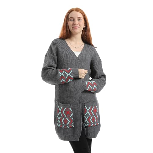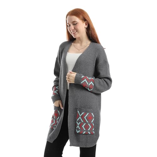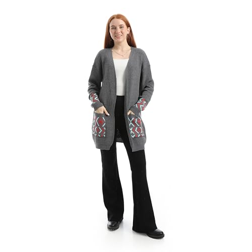 CAESAR - سيزر - كارديجان صوف طويل للنساء بنقشة على الجيب، لون رمادي غامق، مقاس واحد يناسب الجميع