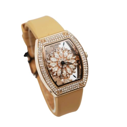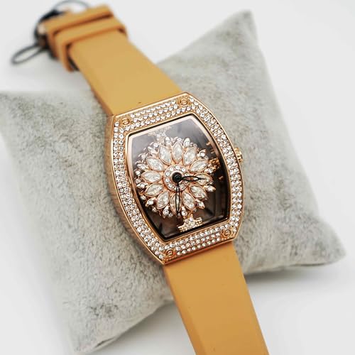 ساعة يد للنساء/ ساعة فاخرة بتصميم زهور كريستال مع إطار من حجر الراين، سوار سيليكون بلون بيج داكن، ذهبي وردي
