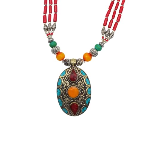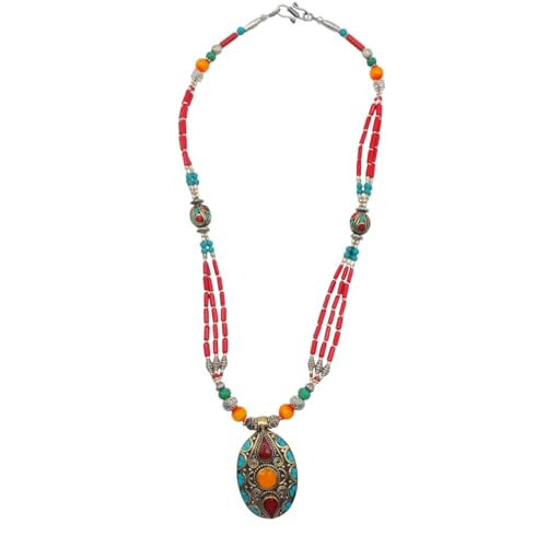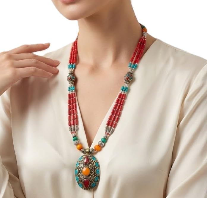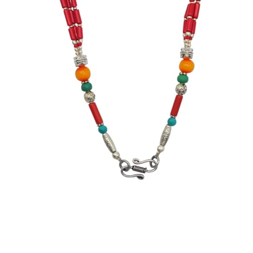 Indian Stones MA - عقد حريمي فاخر من الفضة المخلوطة بالنحاس اقل من العيار مرصع بأحجار طبيعية كريمة من الفيروز والمرجان والكهرمان - متعدد الالوان Awd1
