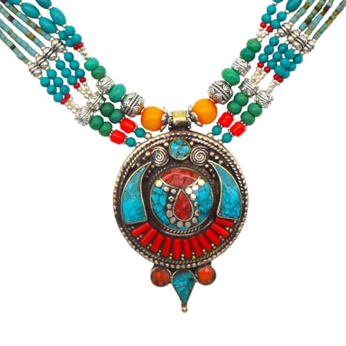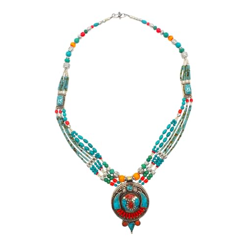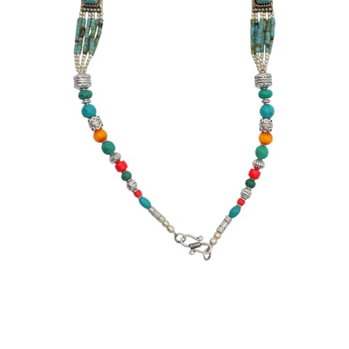Indian Stones MA - عقد حريمي فاخر من الفضة المخلوطة بالنحاس اقل من العيار مرصع بأحجار طبيعية كريمة من الفيروز والمرجان والكهرمان - متعدد الالوان Awd2