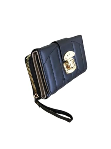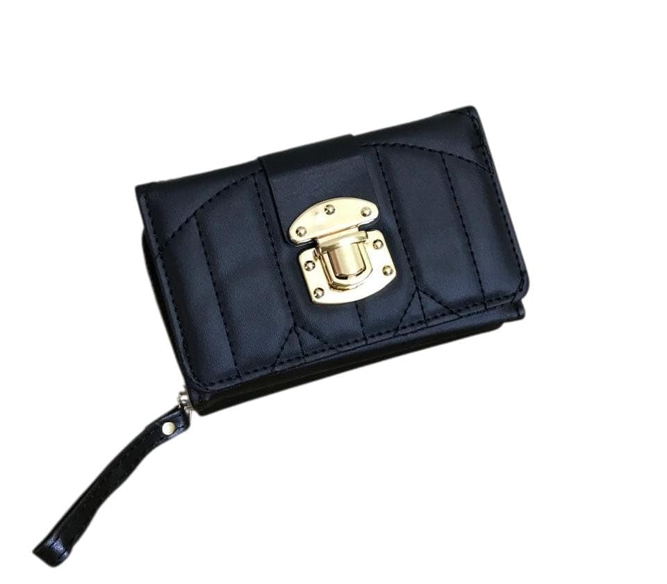 - تصميم أنيق وعصري: محفظة نسائية متوسطة الحجم باللون الأسود مع تفاصيل ذهبية فاخرة وقفل معدني ذهبي مميز يضيف لمسة من الفخامة