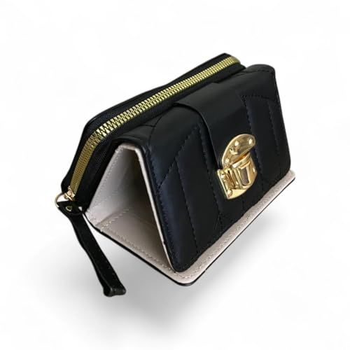 Generic - محفظة نسائية متوسطة الحجم بسوستة، جلد أسود مع تفاصيل ذهبية، متعددة الجيوب لحفظ البطاقات