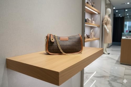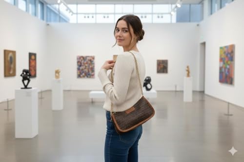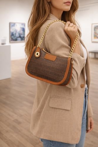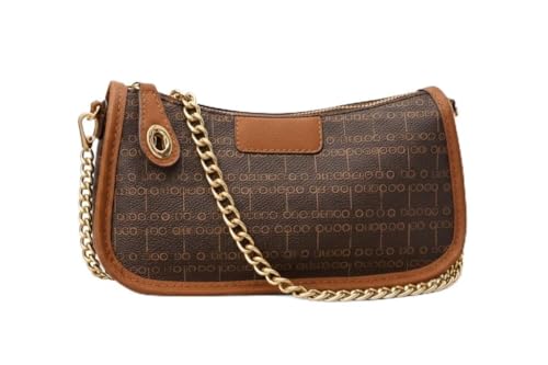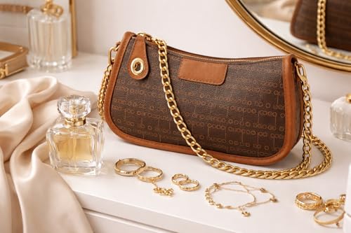 حقيبة كتف نسائية صغيرة بنقشة مونوغرام، بني مع تفاصيل جملي، سلسلة ذهبية، جلد صناعي، تصميم كلاسيكي عصري