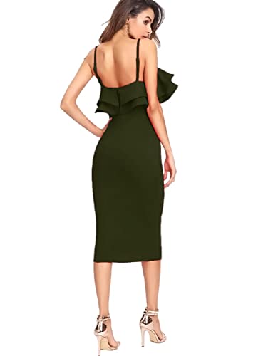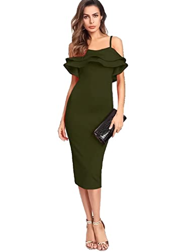 Generic - فستان نسائى زيتى بحمالات من الكتف و مروحة من الصدر