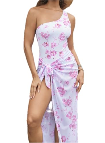 Generic - بدلة سباحة نسائية من قطعة واحدة مع تنورة كاش، طباعة زهور، تصميم بكتف واحد، عالي التمدد، ابيض وبينك