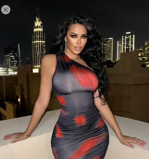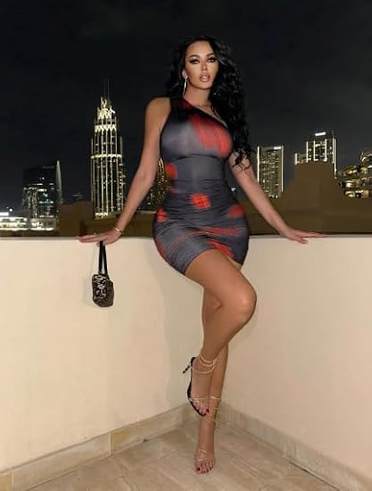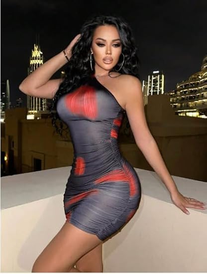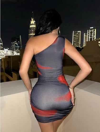 Generic - فستان قصير ضيق بكتف واحد للنساء، طباعة متدرجة باللونين الاحمر والرمادي، تصميم مكشكش، ملابس نوادي الحفلات