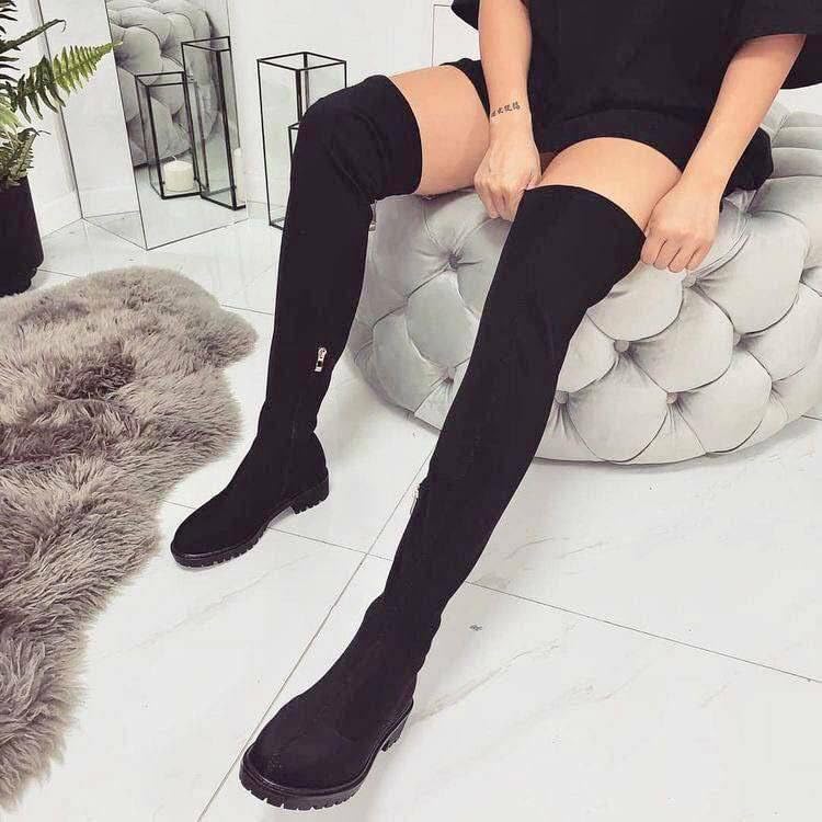 حذاء نسائي طويل فوق الركبة، أسود، كعب منخفض، مادة شامواه - موديل رقم #: 613B