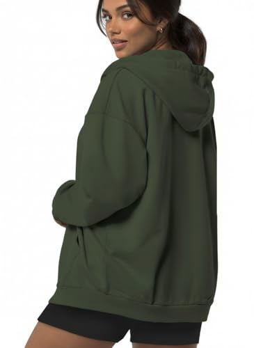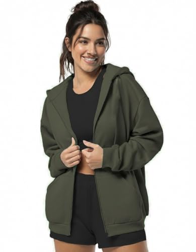 Generic - سويت شيرت بغطاء للرأس وسوستة كبير الحجم بمقاس مريح وكم طويل للنساء، لون أخضر زيتوني