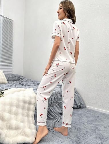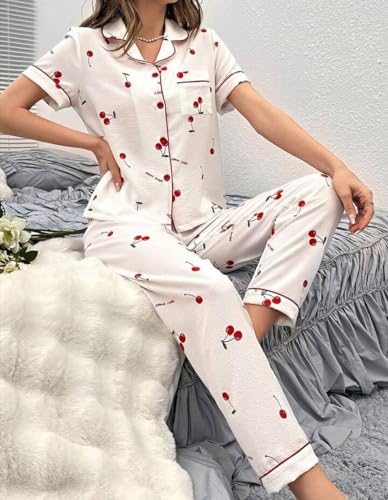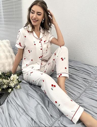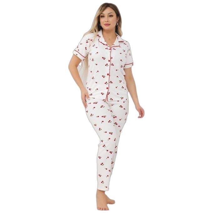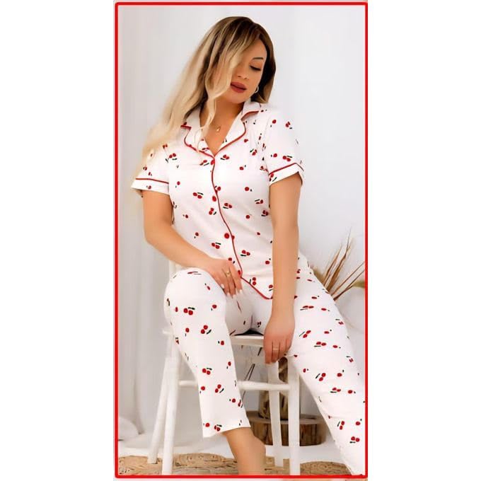 Generic - طقم بيجامة نسائية، تصميم كرز، أبيض وأحمر، قطن، أكمام قصيرة - الخامه قطن - مقاس فرى سايز - موديل رقم #: 574-436