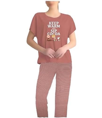 Generic - طقم بيجامة للنساء، مطبوع عليه عبارة Keep Warm and Sip Cocoa، بلوزة باكمام قصيرة مع بنطلون مخطط، مقاسات (M).