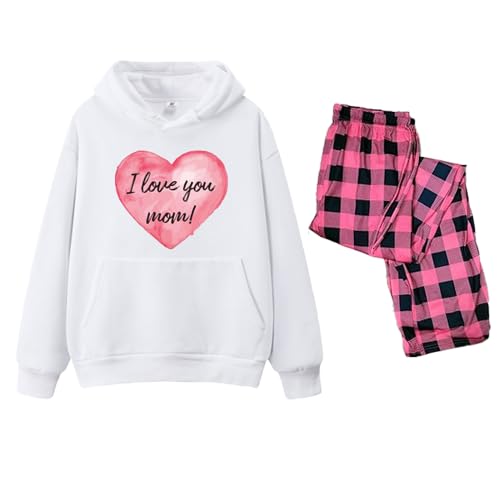 Generic - طقم بيجامة للنساء مكون من سويت شيرت بغطاء رأس أبيض مطبوع عليه عبارة "I Love You Mom" وبنطال وردي وأسود، قطعتان، تصميم خاص بعيد الأم، مقاس سمول (S)