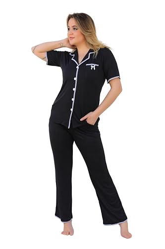 Dadoush - بيجامة حريمي زراير كم قصير سادة - طقم بيجامه نسائي صيفي من قطعتين - بجايم مطرزة بالدانتيل الناعم . (اسود, 6XL)