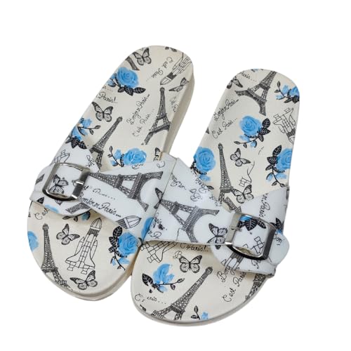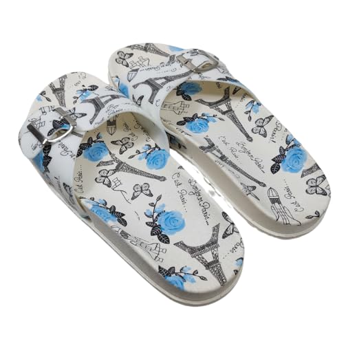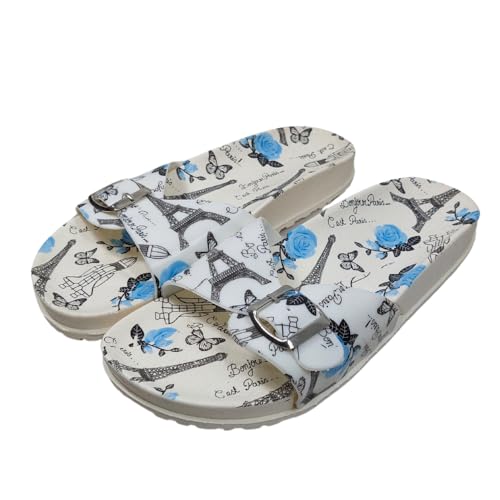 Generic - صندل سهل الارتداء بنمط باريس للنساء، ابيض مع ورود زرقاء وطباعة برج ايفل، مشبك اغلاق مقاس 38 - شبشب حريمي مطاطي مريح