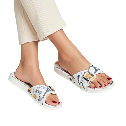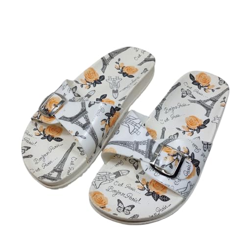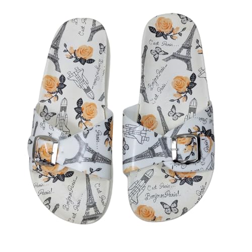 Generic - صندل سهل الارتداء بنمط باريس للنساء، ابيض مع ورود برتقالية وطباعة برج ايفل، مشبك اغلاق مقاس 38 - شبشب حريمي مطاطي مريح
