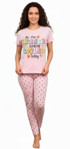 Generic - بيجامة نسائية قطنية وردية مع طباعة رسالة إيجابية، طقم بنطلون منقط للمنزل والنوم