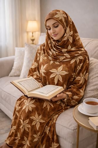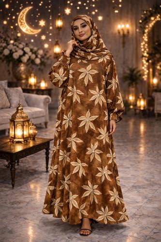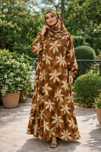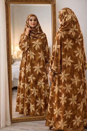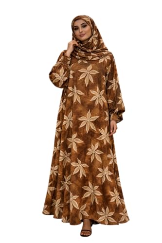 Generic - فستان صلاة للنساء مع حجاب، طباعة زهور بنية اللون، عباية ماكسي باكمام طويلة، طقم ملابس عبادة اسلامية