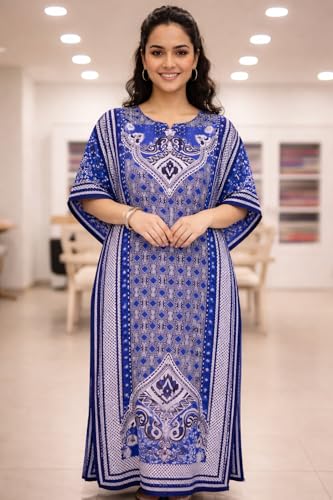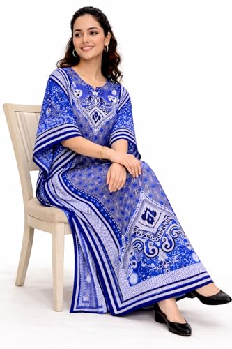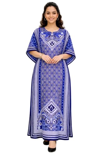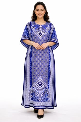 Generic - فستان قفطان ماكسي مطبوع للنساء، ازرق مع نمط هندسي اسود وابيض، اكمام كيمونو، طول طويل، مقاس واحد