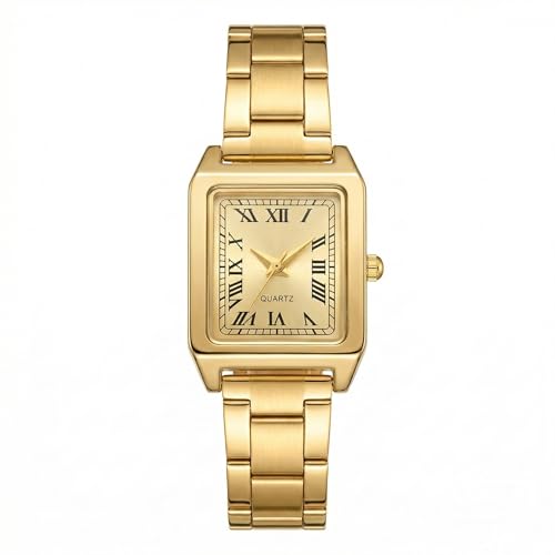 Generic - ساعة كوارتز للنساء، هيكل ذهبي وردي مربع، سوار جلد ابيض، عرض انالوج