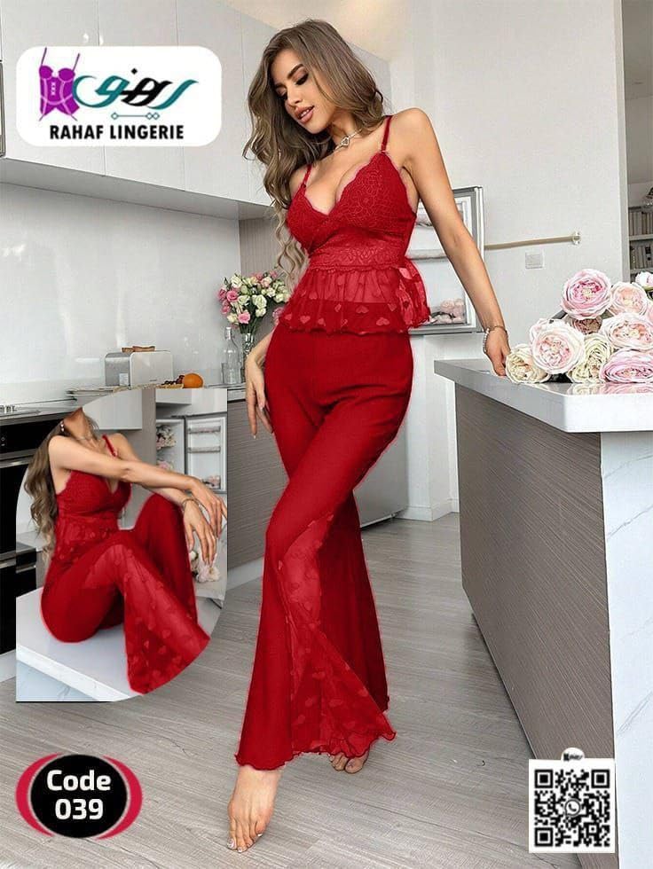 Generic - لانجري نسائي أحمر أنيق، ملابس نوم دانتيل، بنطلون واسع مع حمالات رفيعة