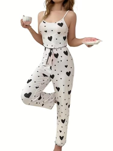 Generic - بيجامة نسائية مضلعة مطبوعة على شكل قلب، ابيض مع قلوب، حزام سباغيتي، خصر مرن، تناسب حتى 65 كجم - بيجامة نسائية بطباعة قلب مضلعة، بيضاء مع قلوب، حمالات رفيعة، خصر مرن، تناسب حتى 65 كجم -
