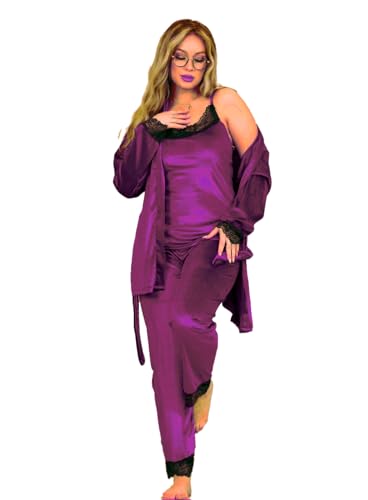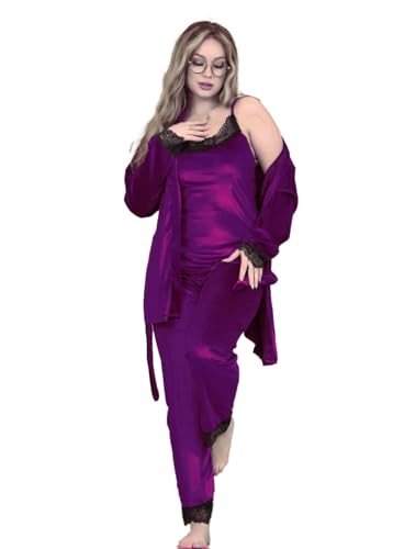 SONDOS FOR HOMEWEAR - طقم ملابس نوم ساتان بحواف من الدانتيل للنساء، أحمر ورمادي، 3 قطع