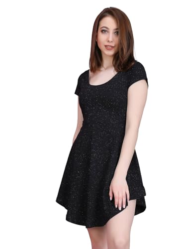 Generic - فستان نسائي قصير بأكمام قصيرة، أسود لامع، تصميم متموج اكس لارچ