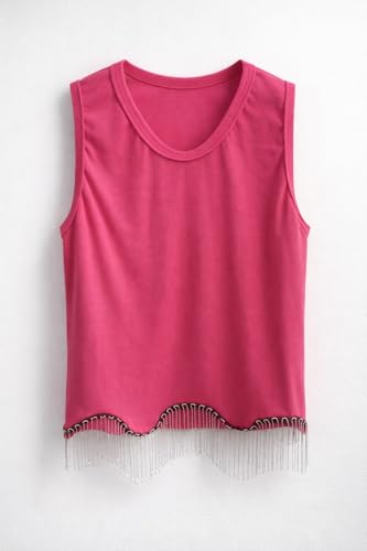 Generic - توب كات بدون أكمام للنساء، نسيج مضلع مع تفاصيل حاشية شراشيب مطرزة، رقبة دائرية، مقاس واحد، وردي فاقع