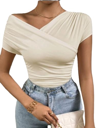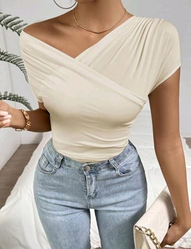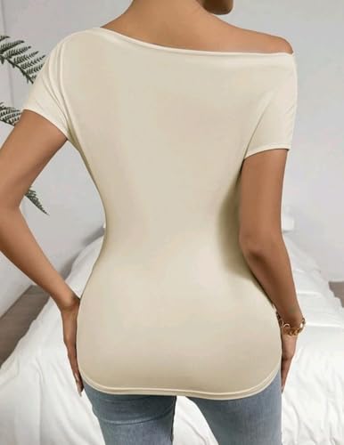 Generic - بلوزة تي شيرت نسائى ضيق بفتحة رقبة غير متماثلة ومطوي، مناسب للصيف اللون : بيج